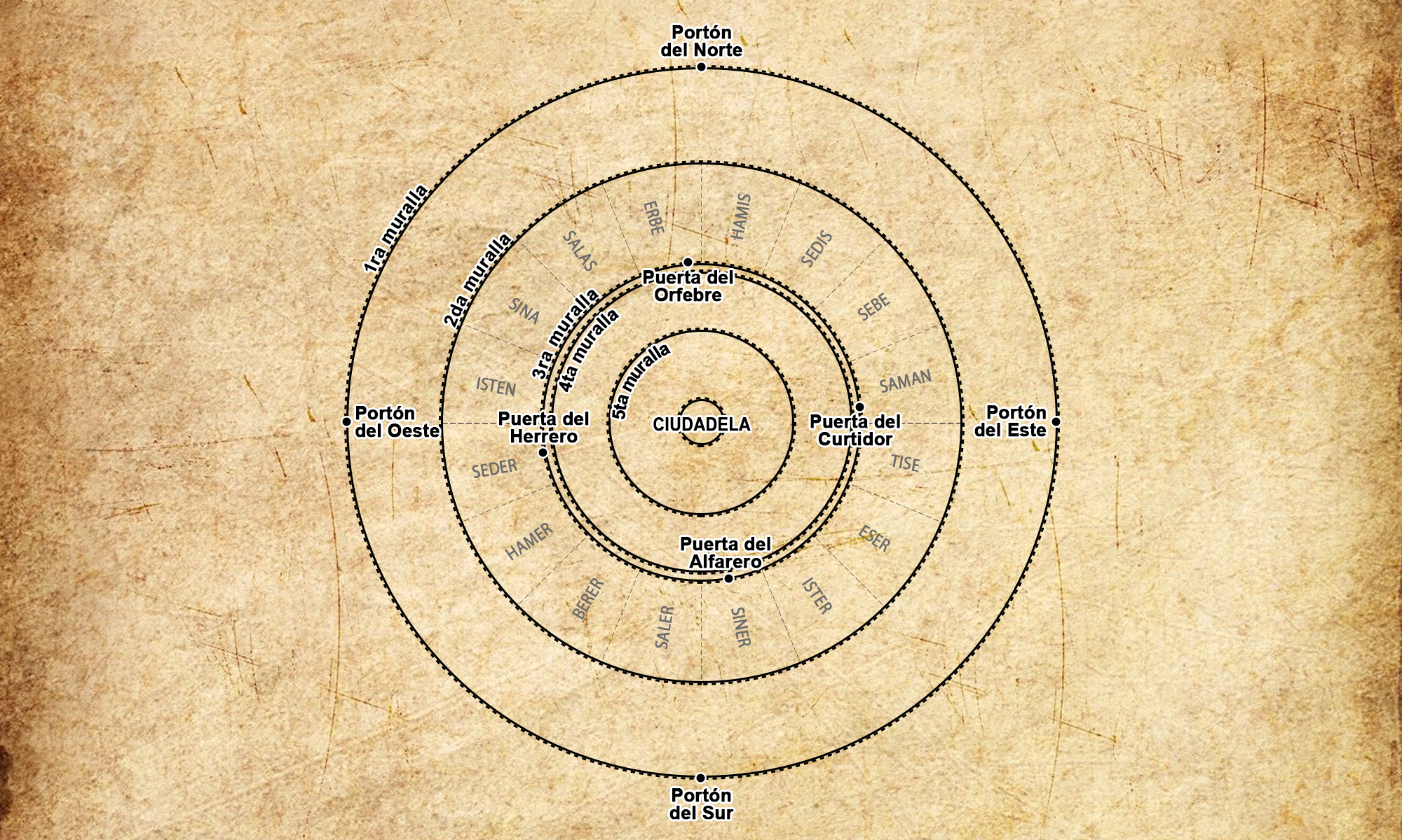 Situada en el desierto de Merjabad, la milenaria ciudad de Daarleh es famosa por sus seis murallas concéntricas y por los cinco anillos que se forman entre ellas. Cada uno acoge a un estrato social, repartiendo a la población según su función y permitiendo al Hayiz gobernar sobre todos desde su palacio de marfil en el centro.